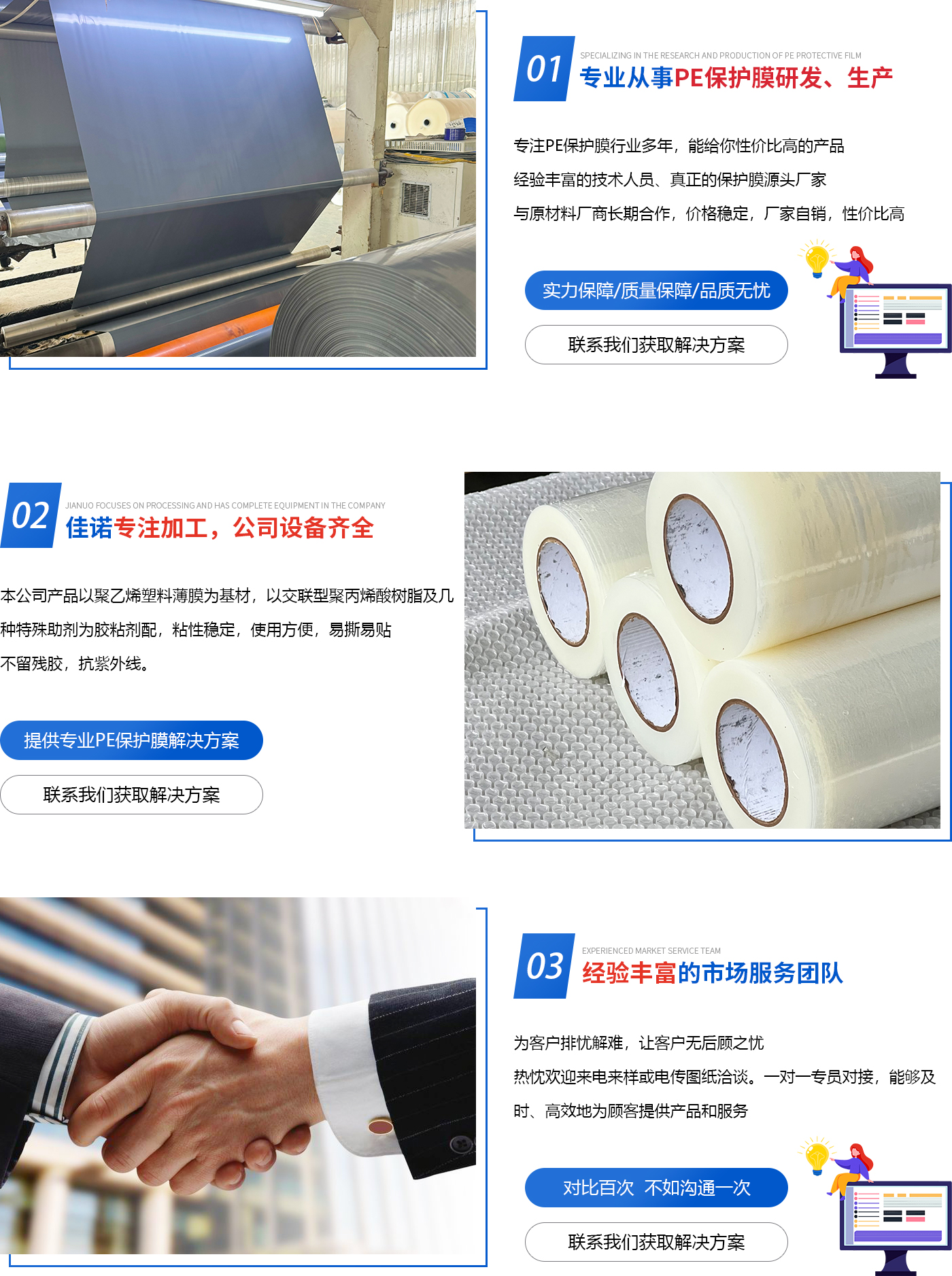 德州佳諾塑業有限公司生產防靜電自粘膜,包裝膜,筒子膜,原模,各種PE保護膜以及保護膜基材。公司生產保護膜、膠帶,是各類不銹鋼板、彩鋼板、鋁塑板、防火板、塑鋼型材、裝飾板、有機玻璃制品、漆面板、鏡面板、外墻板,保溫板,石英石,大理石,人造石,瓷磚,防盜門,木門,不銹鋼門窗,各種裝飾面板,各種建筑板材、地毯,以及電子、家用電器、家具、汽車制造,等行業不可缺少的表面保護材料。使被貼物在運輸、加工、貯存和使用過程中不受污染、腐蝕、劃傷,保護原有的光潔亮澤的表面,從而提高產品質量。 本公司產品用于鋁型材,PVC等材質型材保護膜,鋁門等鋁制品保護膜,鋁塑板,不繡鋼,鋁合金等產品表面保護膜,保護其在運輸途中,生產,安裝時對產品表面所造成的刮傷,灰塵等??捎糜?,汽車門,木地板,冰箱表面等家電及電子產品表面的保護。 基材:PE材質 粘性:低粘,中粘,高粘,特高粘 膜材:透明膜,藍膜,黑白膜,乳白膜 ( 除藍膜外,其...